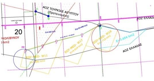 -Το θαλασσοτεμάχιο EG-MED-W18 και στην βόρεια πλευρά του φαίνεται ότι επεκτείνεται πέραν του 28ου μεσημβρινού (διέρχεται από το σημείο Α) με κατεύθυνση νοτιοανατολική. Το βόρειο αυτό τμήμα της επέκτασης του, συμπίπτει με την γραμμή οριοθέτησης που αυθαίρετα όρισε στο παρελθόν η Τουρκία σαν σύνορο μεταξύ αυτής και της Αιγύπτου για να την δελεάσει, αγνοώντας την εν δυνάμει ΑΟΖ της Ελλάδας, η οριοθέτηση της οποίας φαίνεται στο σχήμα 3 νοτιότερα (με γαλάζιο χρώμα). Η επέκταση αυτή του θαλασσοτεμαχίου ανατολικά, θίγει το εν δυνάμει κομμάτι της ελληνικής ΑΟΖ ανατολικά του 28ου μεσημβρινού, συνολικής έκτασης 3.654 τετρ. χλμ. (Σχήμα 3-περιοχή με γαλάζιες κουκίδες) κατά ένα σημαντικό μέρος (Σχήμα 3 κόκκινος κύκλος).