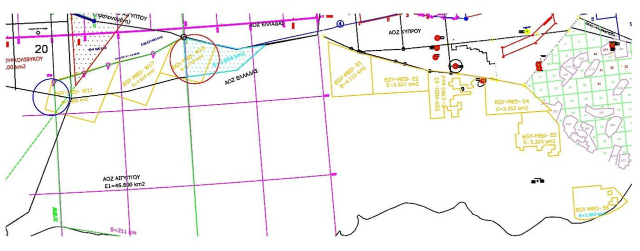 -Το βόρειο άκρο των τριών δυτικών θαλασσοτεμαχίων (EG-MED-W1,17,18) συμπίπτει με την γραμμή μερικής οριοθέτησης των ΑΟΖ μεταξύ Ελλάδας και Αιγύπτου (σημεία A,B,C,D,E), που πρόσφατα συμφωνήσαμε μεταξύ του 26ου και του 28ου μεσημβρινού.