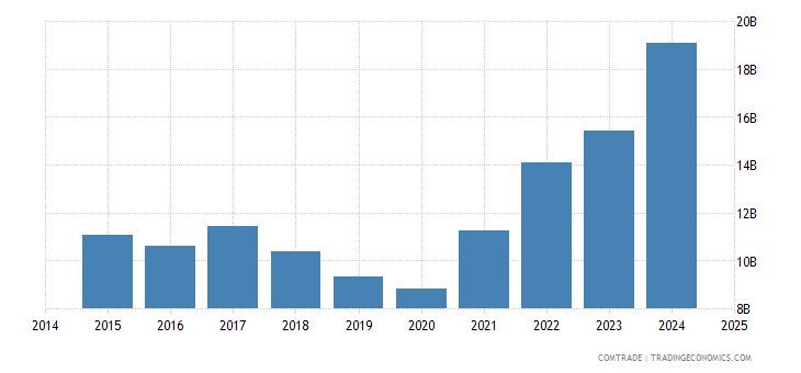 Εξαγωγές Ιταλίας προς την Τουρκία για τα έτη 2012-2021 σε δισ. δολάρια. Πηγή: tradingeconomics.com