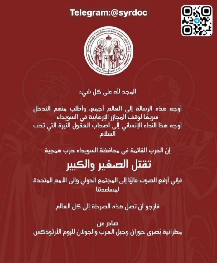 Η Ελληνική Ορθόδοξη Αρχιεπισκοπή της Βόσρας, του Χοράν, του Τζαμπάλ αλ-Άραμπ και του Γκολάν εξέδωσε απεγνωσμένη έκκληση για διεθνή παρέμβαση ώστε να σταματήσει αυτό που περιγράφει ως “πόλεμο εξόντωσης” κατά των κοινοτήτων των Δρούζων και των Χριστιανών στη Μουχαφαζά της Σουέιντα στη Συρία. Σε δήλωση που εκδόθηκε νωρίς την Κυριακή, η Αρχιεπισκοπή καταδίκασε τις σκληρές δολοφονίες πολιτών από ισλαμιστικές δυνάμεις, ζητώντας από τη διεθνή κοινότητα να δράσει γρήγορα για να σταματήσει η αιματοχυσία.