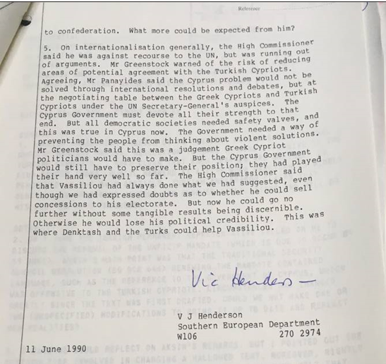 «Vasiliou has shown himself hugely more imaginative and courageous than his two predecessors as president. He represents a precious asset for us, both in his tolerance of our continued untroubled tenure of the bases and because he means to secure a settlement while he is in office…».