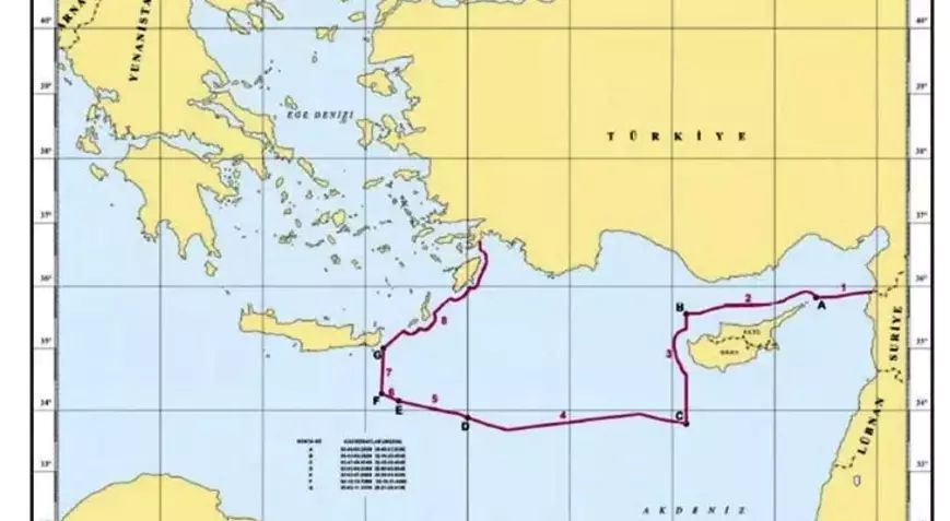 Όσον αφορά τα όρια θαλάσσιας δικαιοδοσίας της Τουρκίας βάσει του διεθνούς δικαίου, η Τουρκία έχει καταθέσει στα Ηνωμένα Έθνη τις γεωγραφικές συντεταγμένες των εξωτερικών ορίων της υφαλοκρηπίδας της στην Ανατολική Μεσόγειο, σύμφωνα με προηγούμενες επιστολές της (2004, 2005, 2013, 2014, 2019 και 2020).